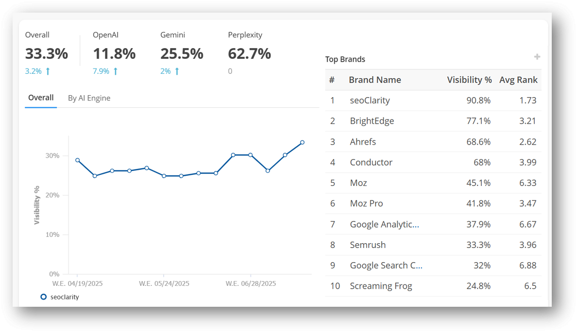 Рынок инструментов AI-видимости активно развивается. В 2025 году доступны решения для любого бюджета: от бесплатных (HubSpot) до enterprise ($3000+/месяц, seoClarity).