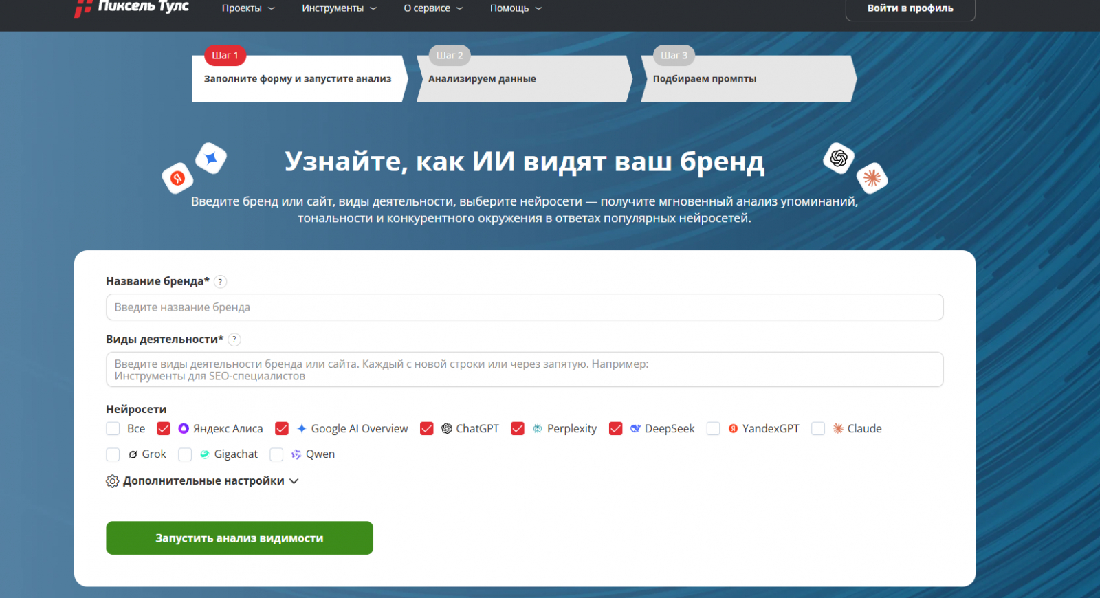 PixelTools AI SEO— продукт известной российской SEO-компании PixelPlus. Сервис предлагает базовый мониторинг AI-видимости с поддержкой российских нейросетей.
