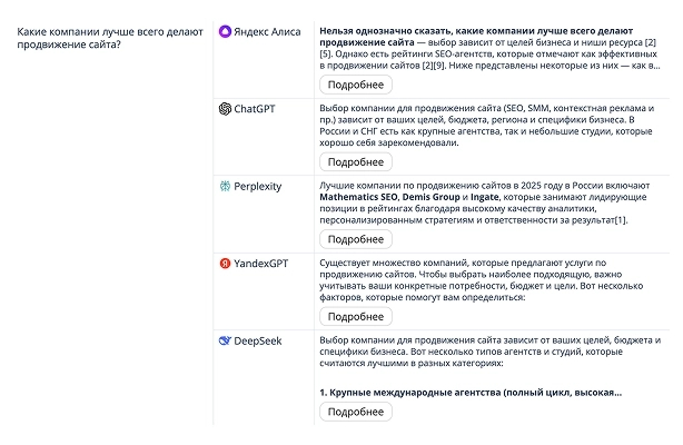Яндекс Алиса, Google AI Overview, ChatGPT, Perplexity, DeepSeek, YandexGPT, Claude, Grok, Qwen