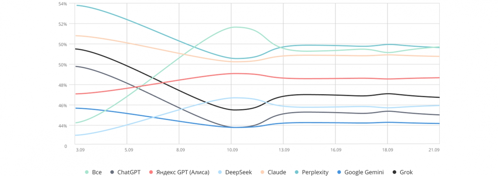 - Российская аудитория: YandexGPT (Алиса AI), GigaChat, ChatGPT, Gemini, Deepseek