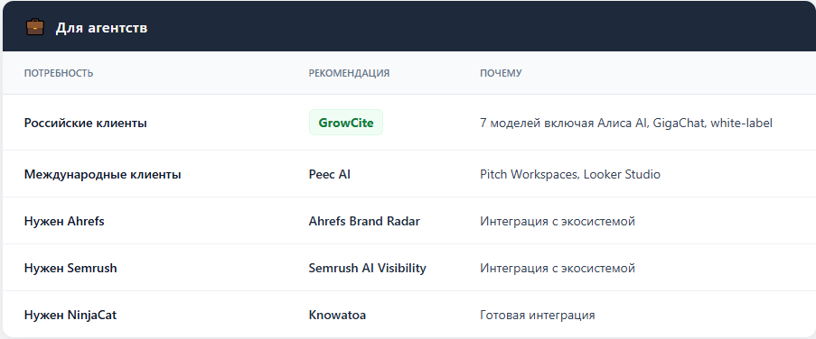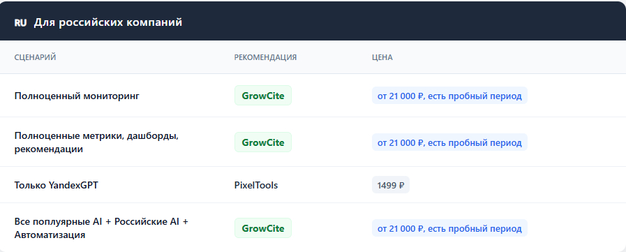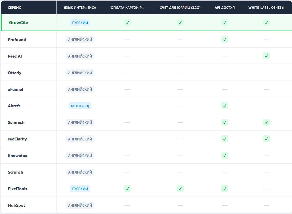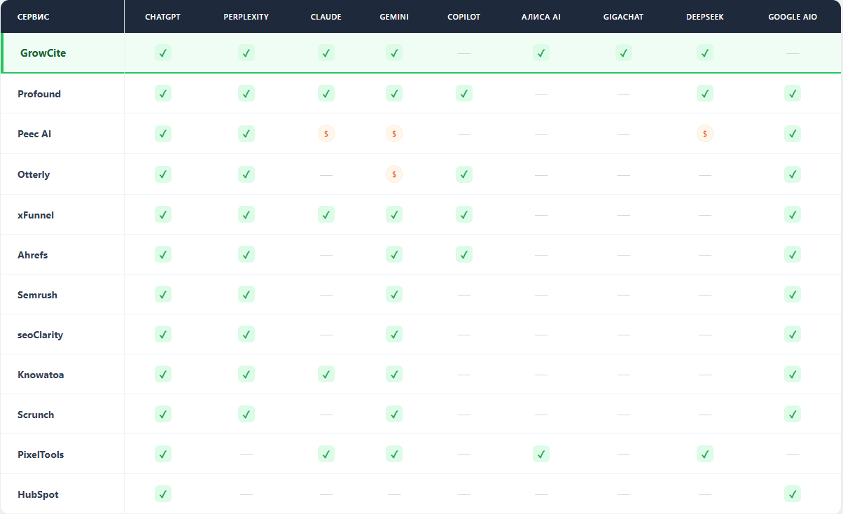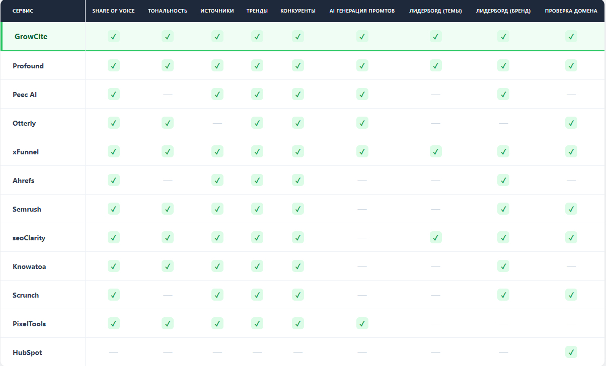 1. Для российского рынка единственный полноценный выбор — GrowCite с поддержкой YandexGPT, GigaChat и Алисы, лидербордами по темам и конкурентам, бесплатной проверкой AI-готовности сайта