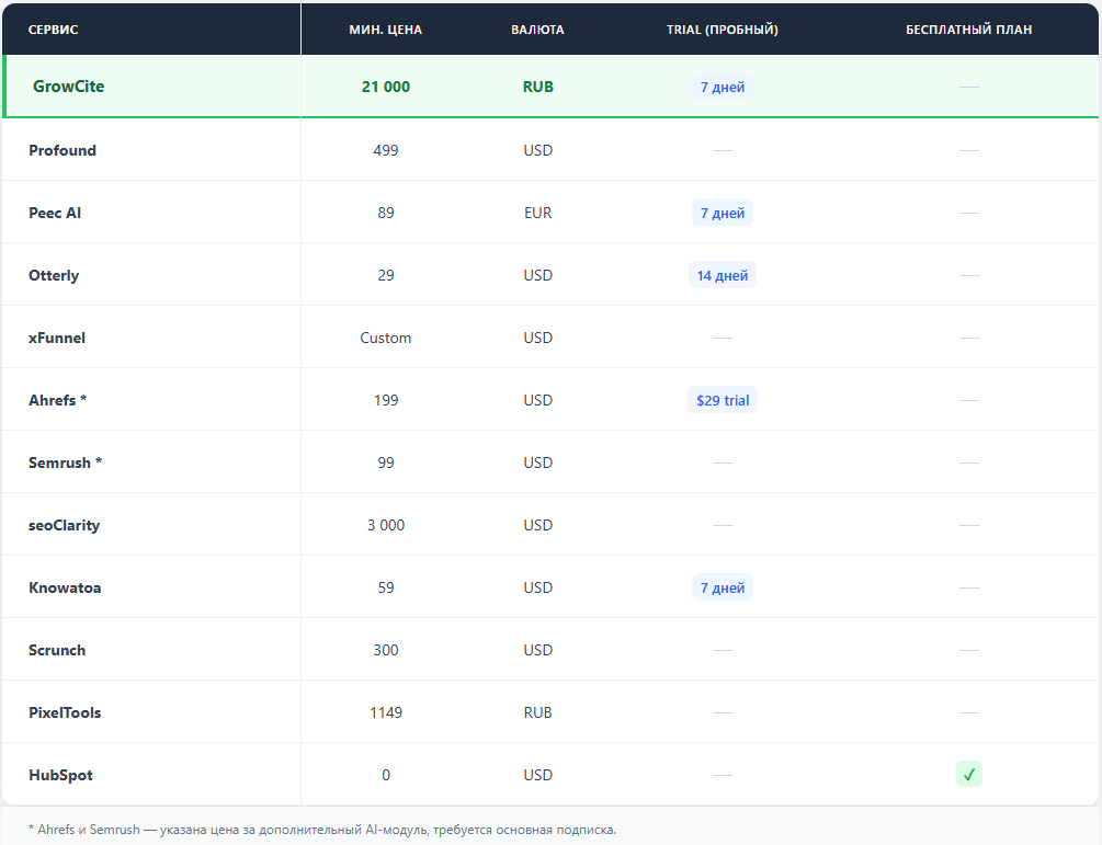 Начать можно бесплатно: HubSpot AI Grader для первичной оценки. Для полноценного мониторинга минимальный бюджет - от $89/месяц (Peecai) или ₽21 000/месяц (GrowCite для российского рынка).