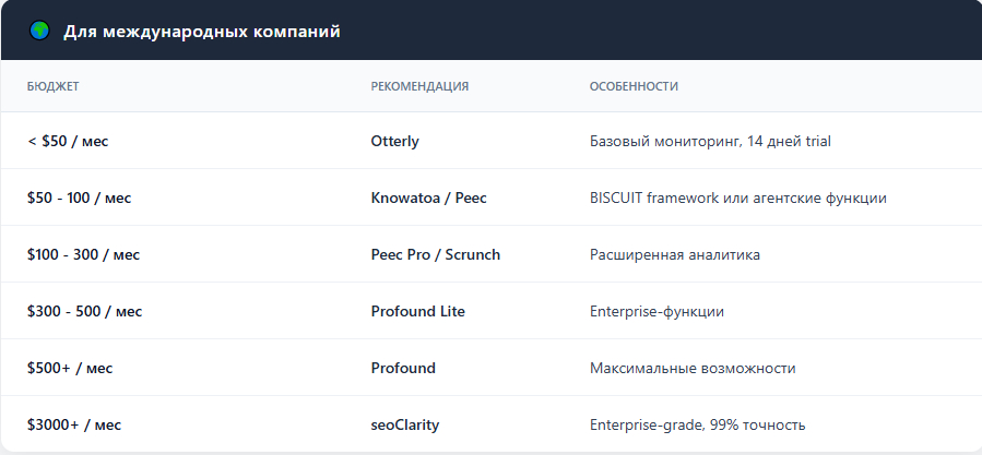 2. Для международных enterprise — Profound с базой 400M+ промптов и инвестициями $50M+