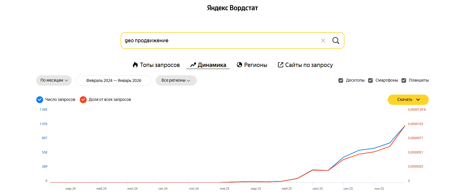 - Процент видимости — доля запросов, в которых бренд упоминается.