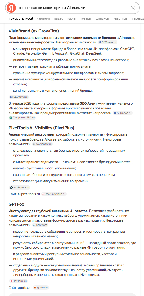 Яндекс Поиск с Алисой — самые подробные ответы. Перечисляет российские сервисы с детальным описанием функционала. VisioBrand стабильно на 1–2 позиции, PixelTools и GPTFox также в каждом ответе.