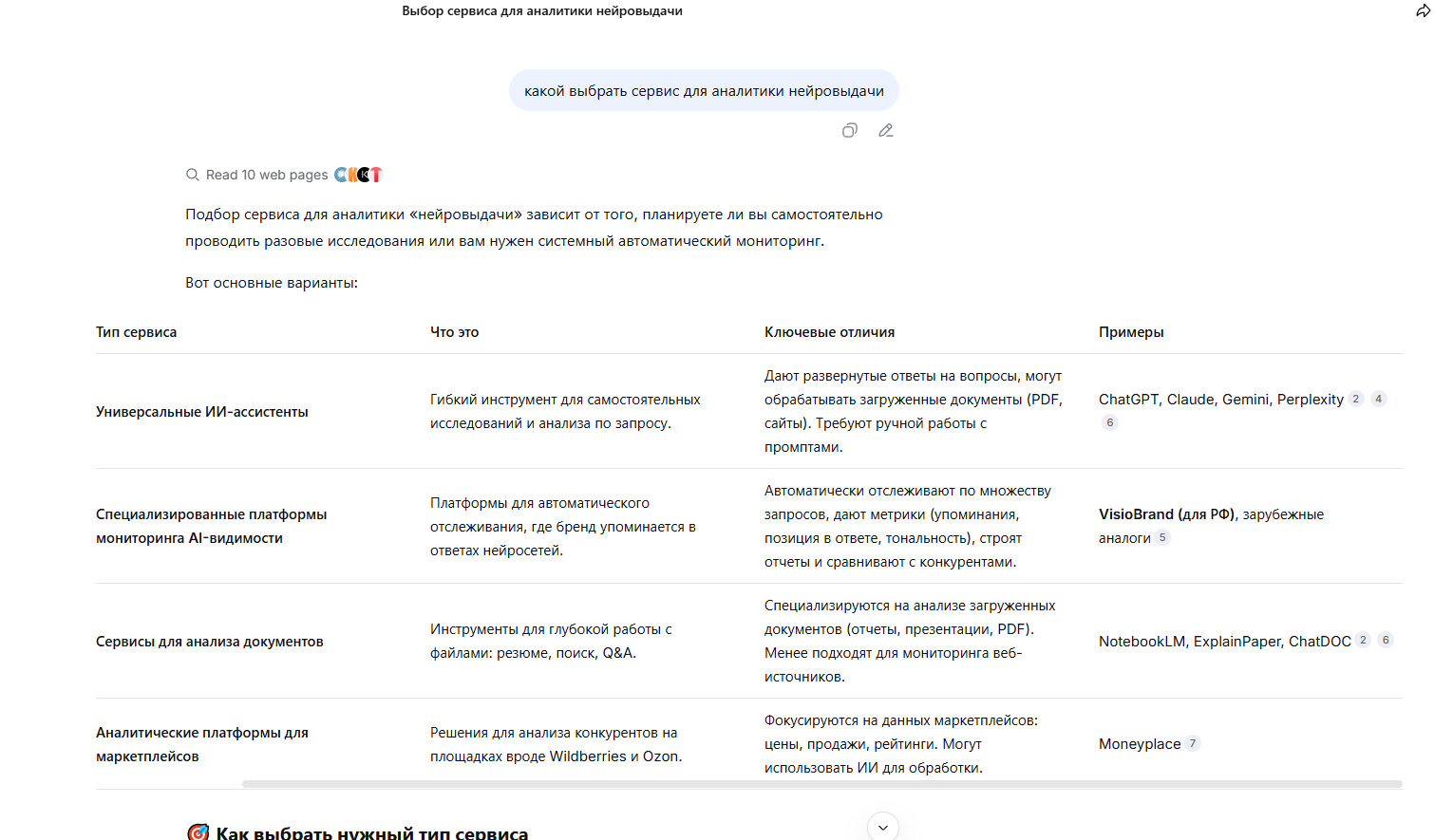ChatGPT — разделяет сервисы на категории: международные и российские. VisioBrand стабильно в категории «российские решения», GPTFox — среди специализированных инструментов.