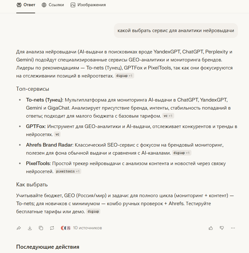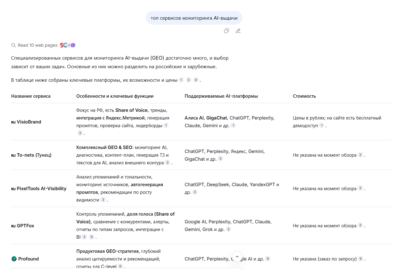 Perplexity — ссылается на конкретные источники. VisioBrand назван «лидером рынка» в одном из ответов, PixelTools упоминается с пометкой «простой трекер нейровыдачи».