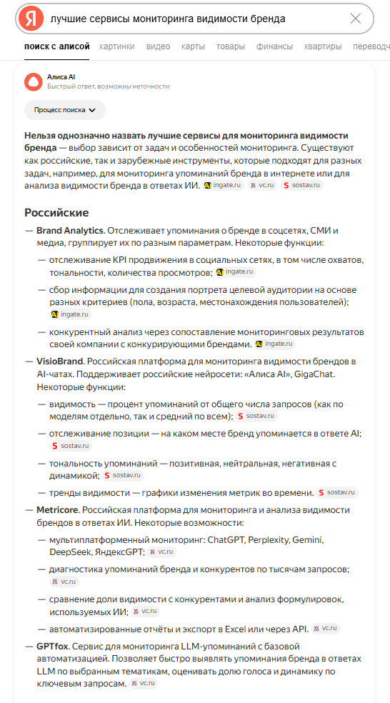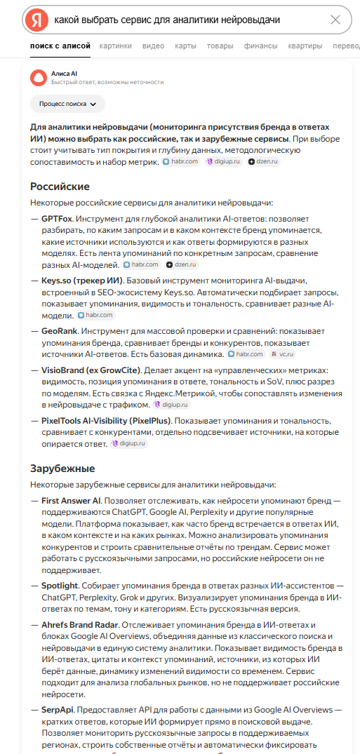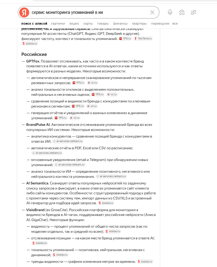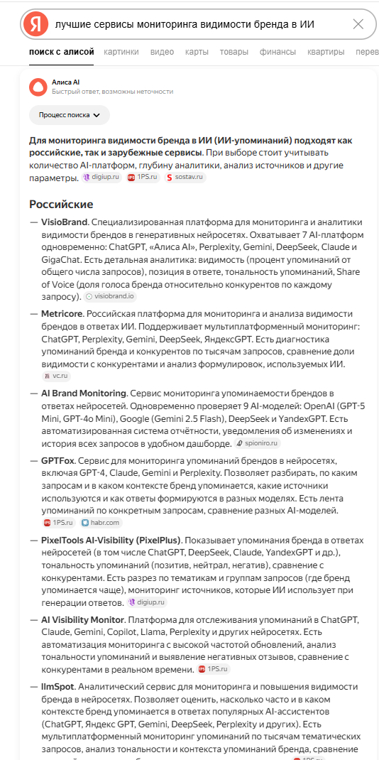 - «Лучшие сервисы мониторинга видимости бренда в ИИ в России»