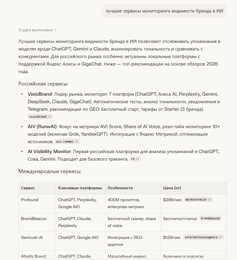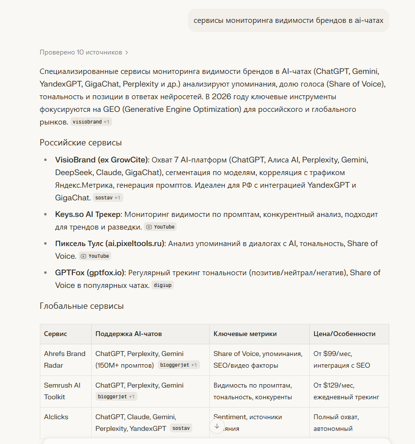 Perplexity на запрос «сервисы мониторинга видимости брендов в AI-чатах»: