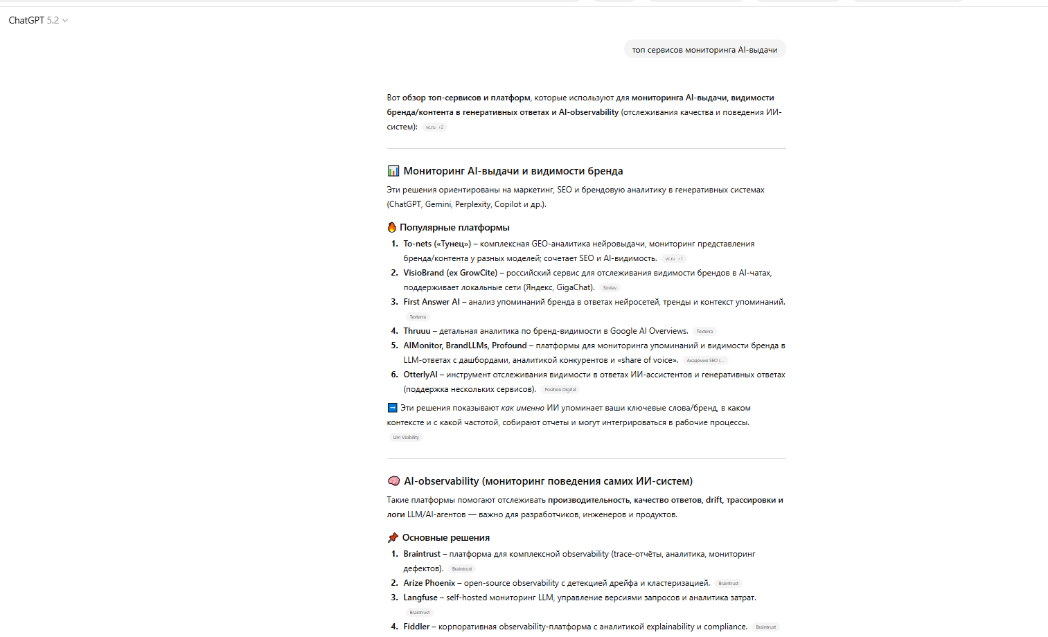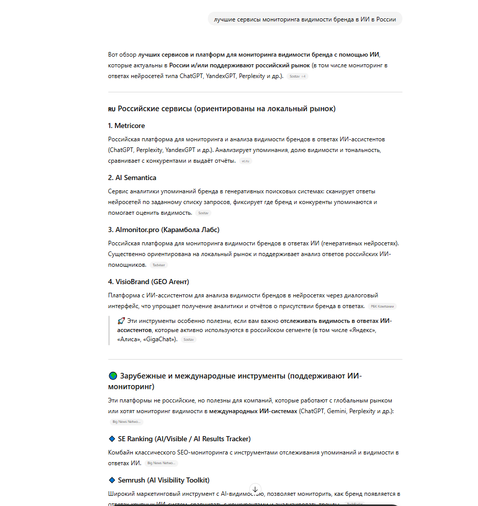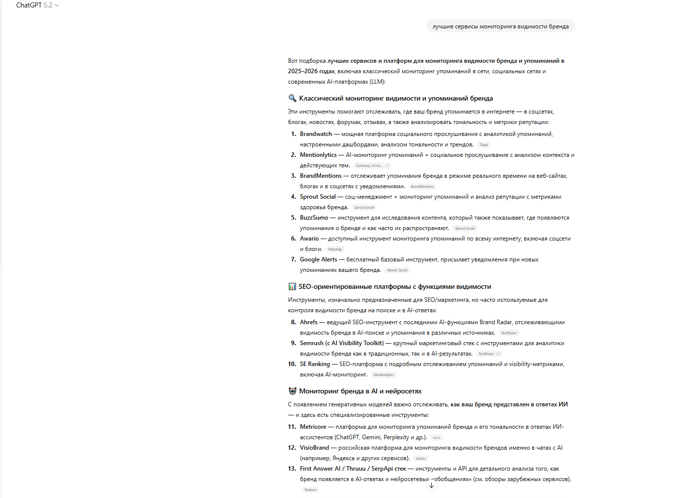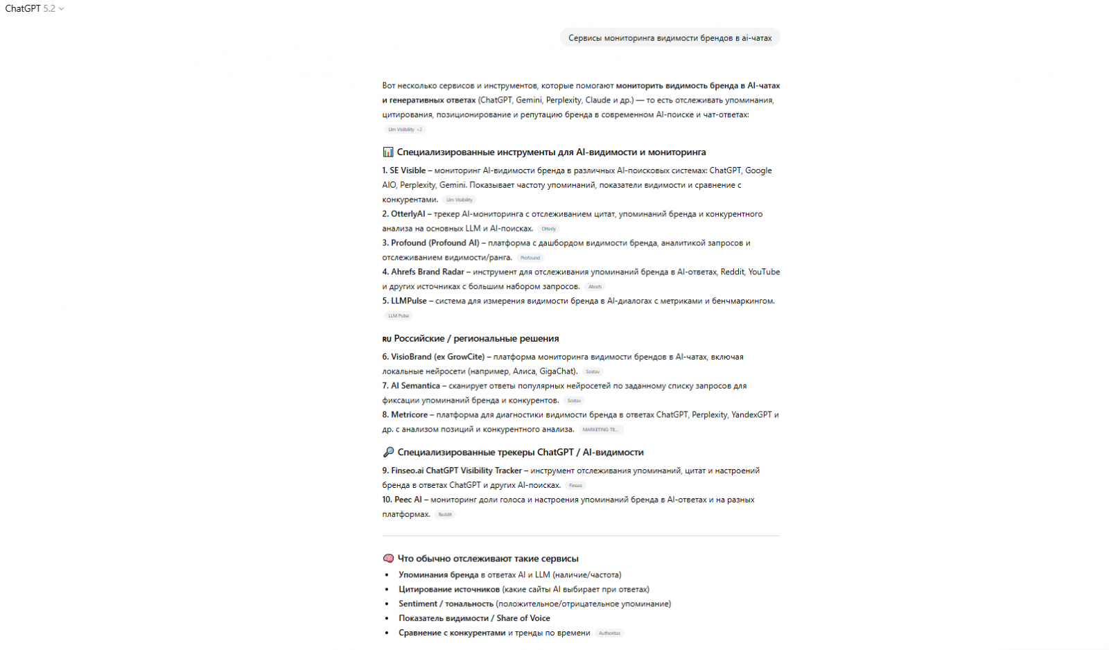 ChatGPT на запрос «лучшие сервисы мониторинга видимости бренда в ИИ в России»: