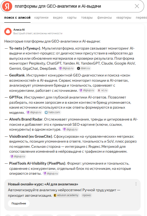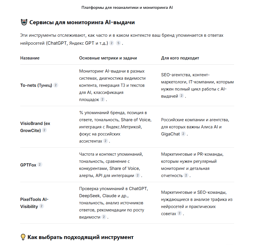 - «Платформы для GEO-аналитики и AI-выдачи»