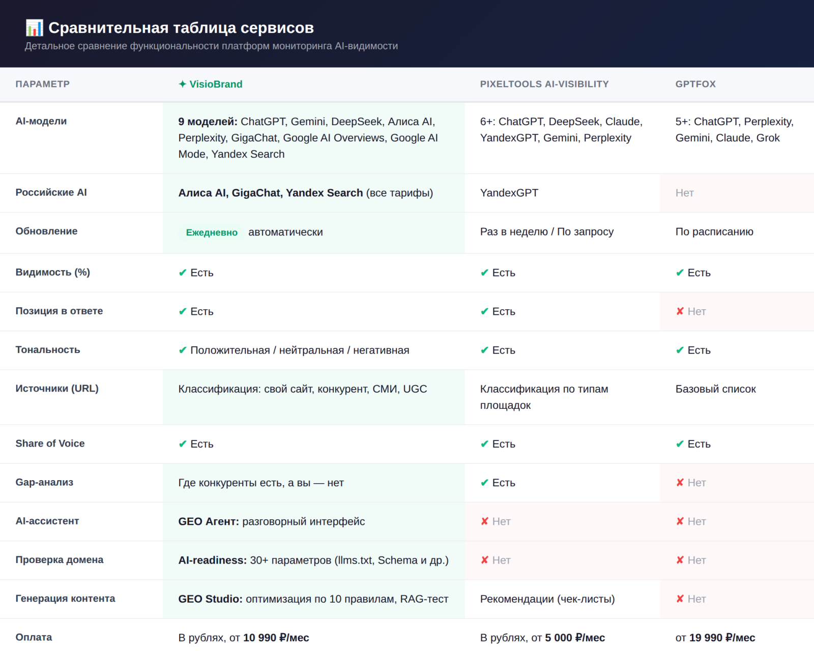 «VisioBrand (RU) — фокус на России, Share of Voice, тренды, интеграция с Яндекс.Метрикой, генерация промптов, лидерборды. Поддерживает: Alice AI, GigaChat, ChatGPT, Perplexity, Claude, Gemini»