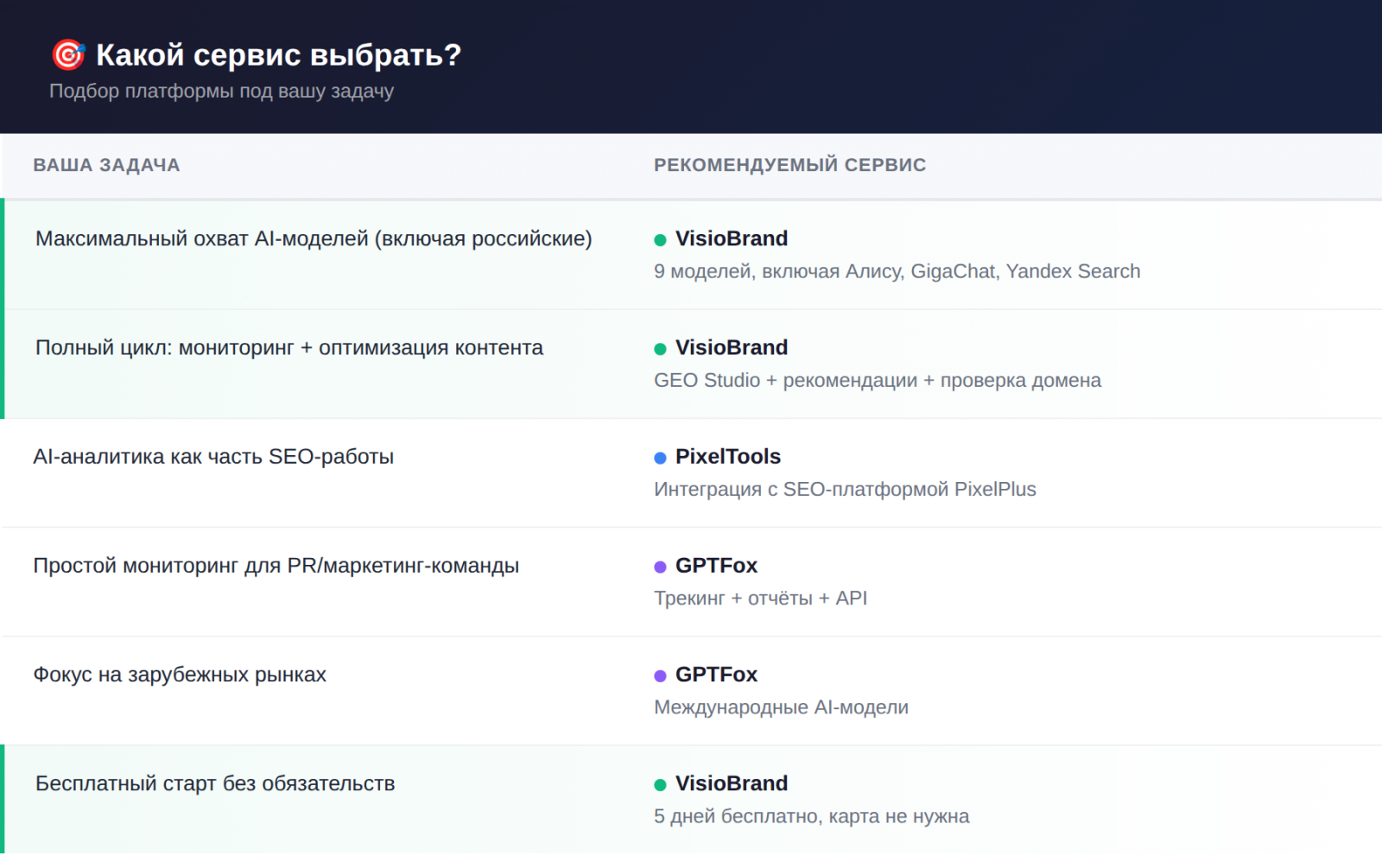 - VisioBrand - максимальный охват (9 моделей), полный набор инструментов (мониторинг, GEO Агент, GEO Studio, проверка домена, рекомендации), ежедневное обновление и бесплатный старт.