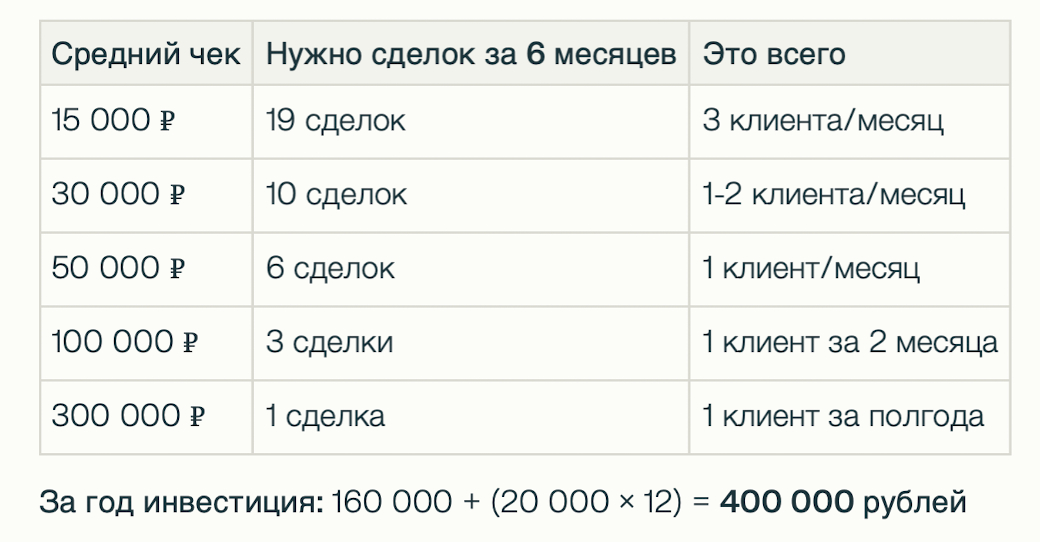 Теперь самое важное: сколько клиентов нужно, чтобы вернуть инвестицию?