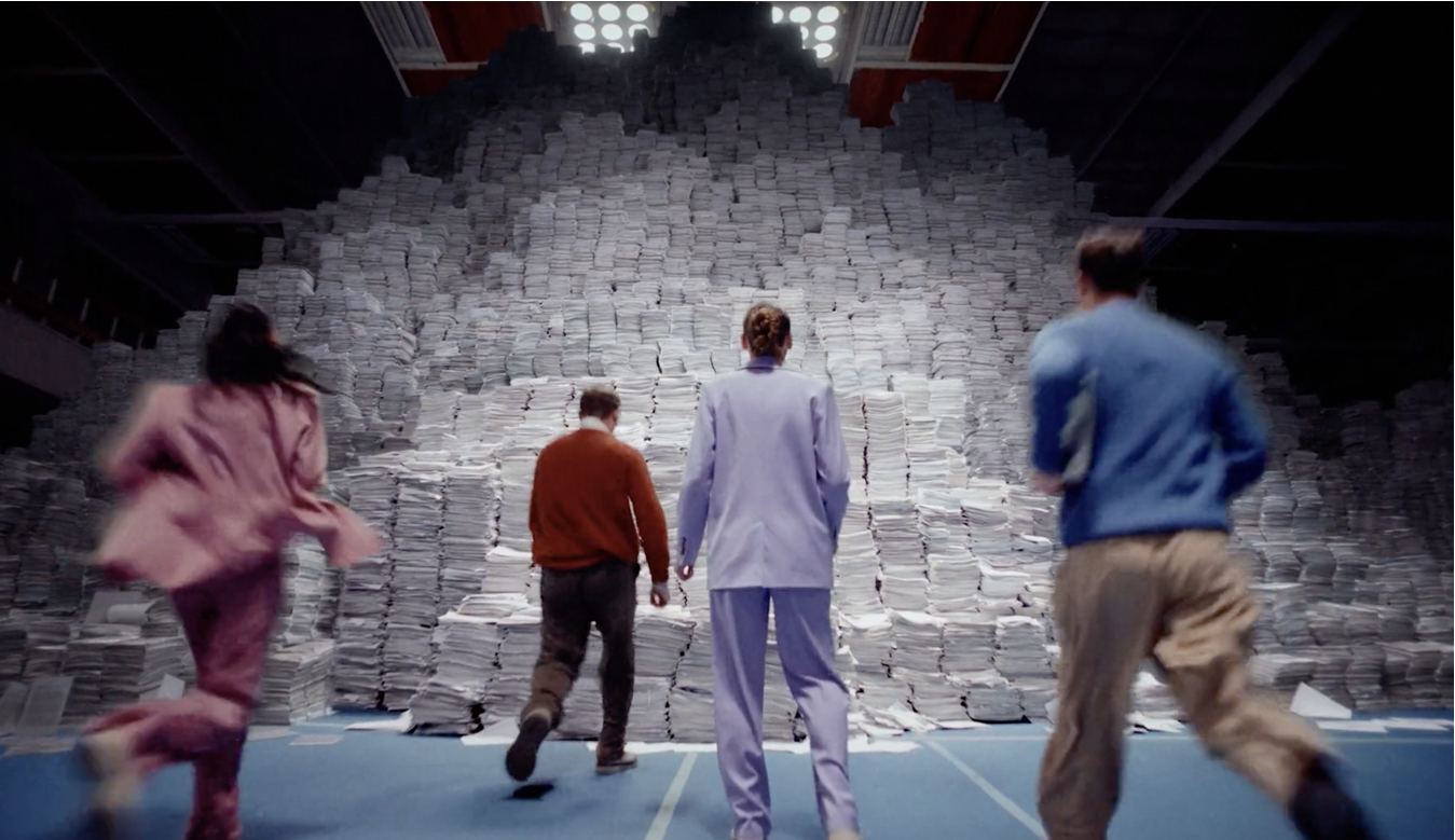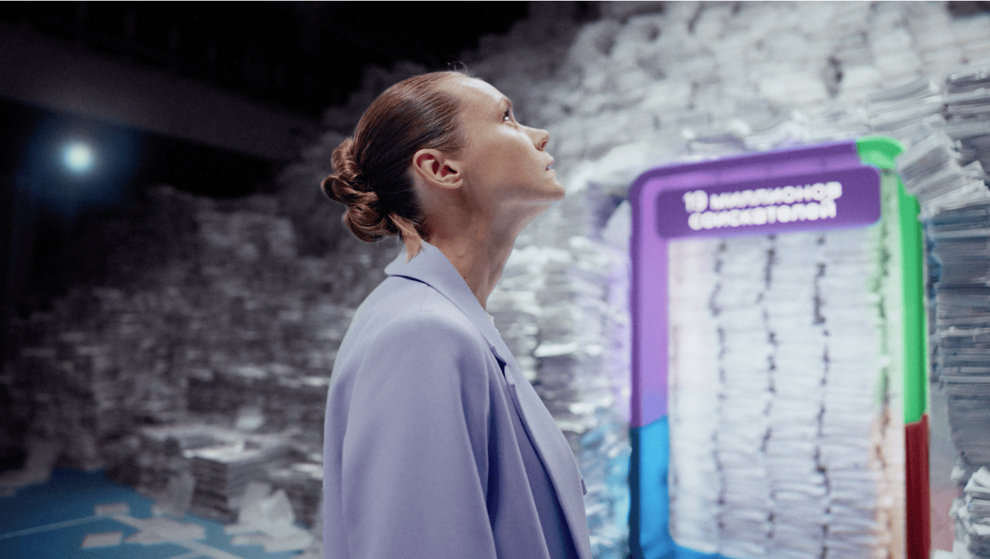 Чтобы CG-часть горы выглядела как продолжение реальной бумаги, мы просканировали фактуру и форму собранных стопок и использовали эти данные в 3D. А еще, каждая сцена снималась на отдельную камеру он-сет супервайзера, чтобы потом получить HDR-карты освещения и внедрить гору в кадр с правильным светом и рефлексами.