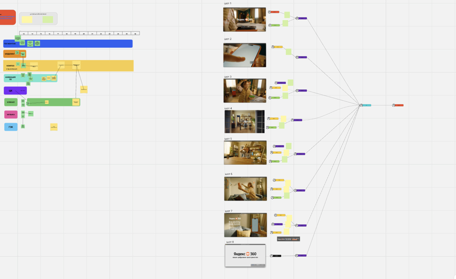 Miro-структура. Вся работа велась в Miro с разбивкой по шотам, апдейтам и схемой пути проекта. Это «цифровой двойник» для продюсера, где видна эволюция каждого кадра и все изменения. Не нужно листать переписку за три дня, чтобы понять, какая версия актуальна и что было исправлено.