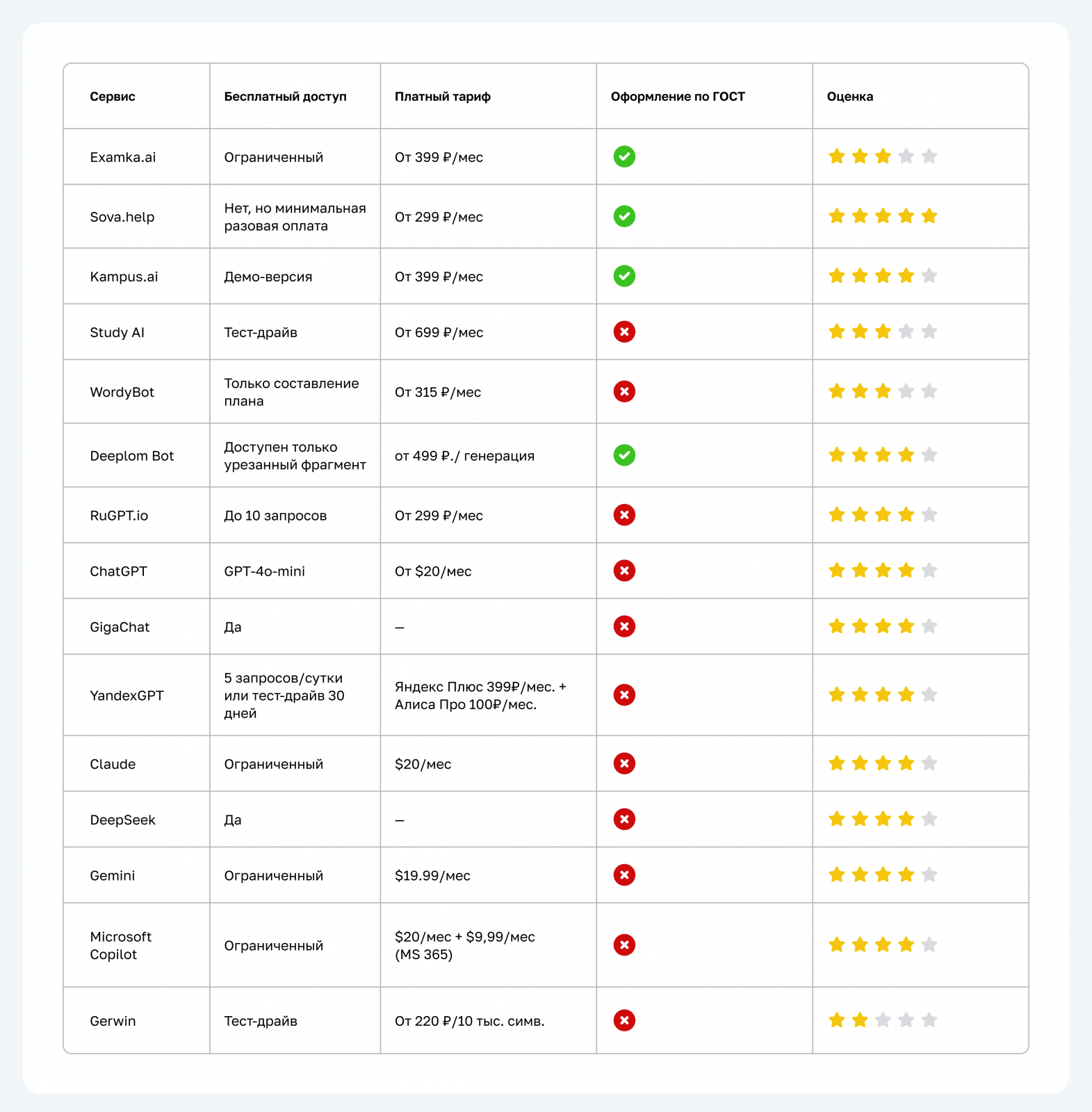 Разовая генерация в sova.help — самая низкая цена на рынке. Подписки варьируются от 299 до 600 ₽/месяц в зависимости от сервиса и функционала.