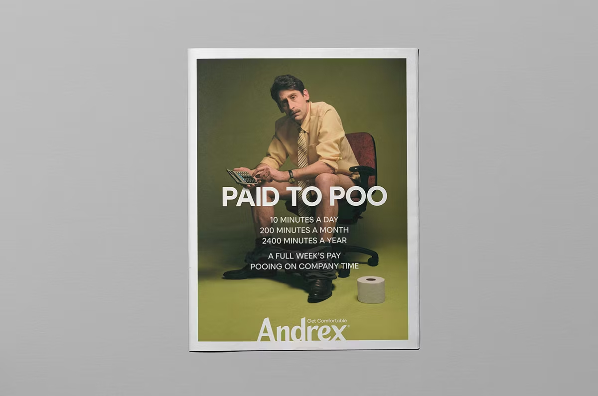 Британский бренд туалетной бумаги Andrex запустил платформу Get Comfortable, построенную на прямом разговоре о ситуациях, которых люди обычно стесняются. Кампания опиралась на исследование бренда, по которому около половины людей стесняются какать на работе или дома у партнёра, а в наружной рекламе использовались формулировки вроде “Live unclenched” («Живи без напряжения») и “Conquer the first office poo” («Преодолей первую офисную какашку»).
