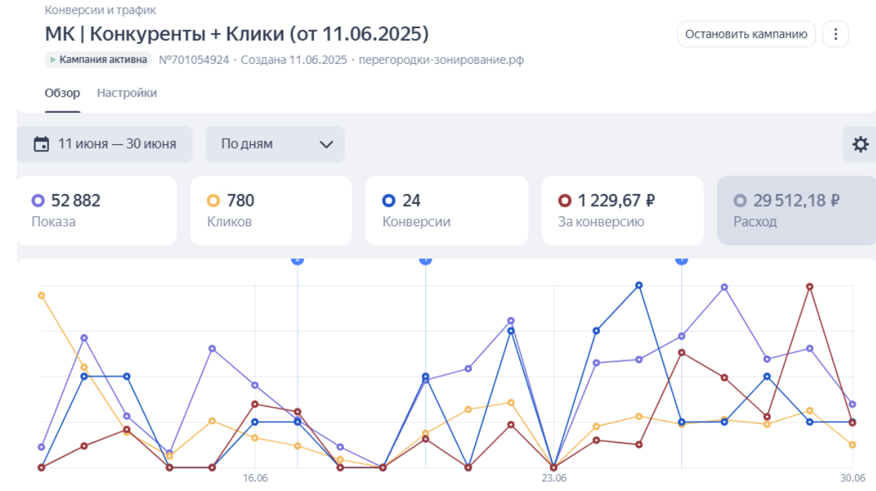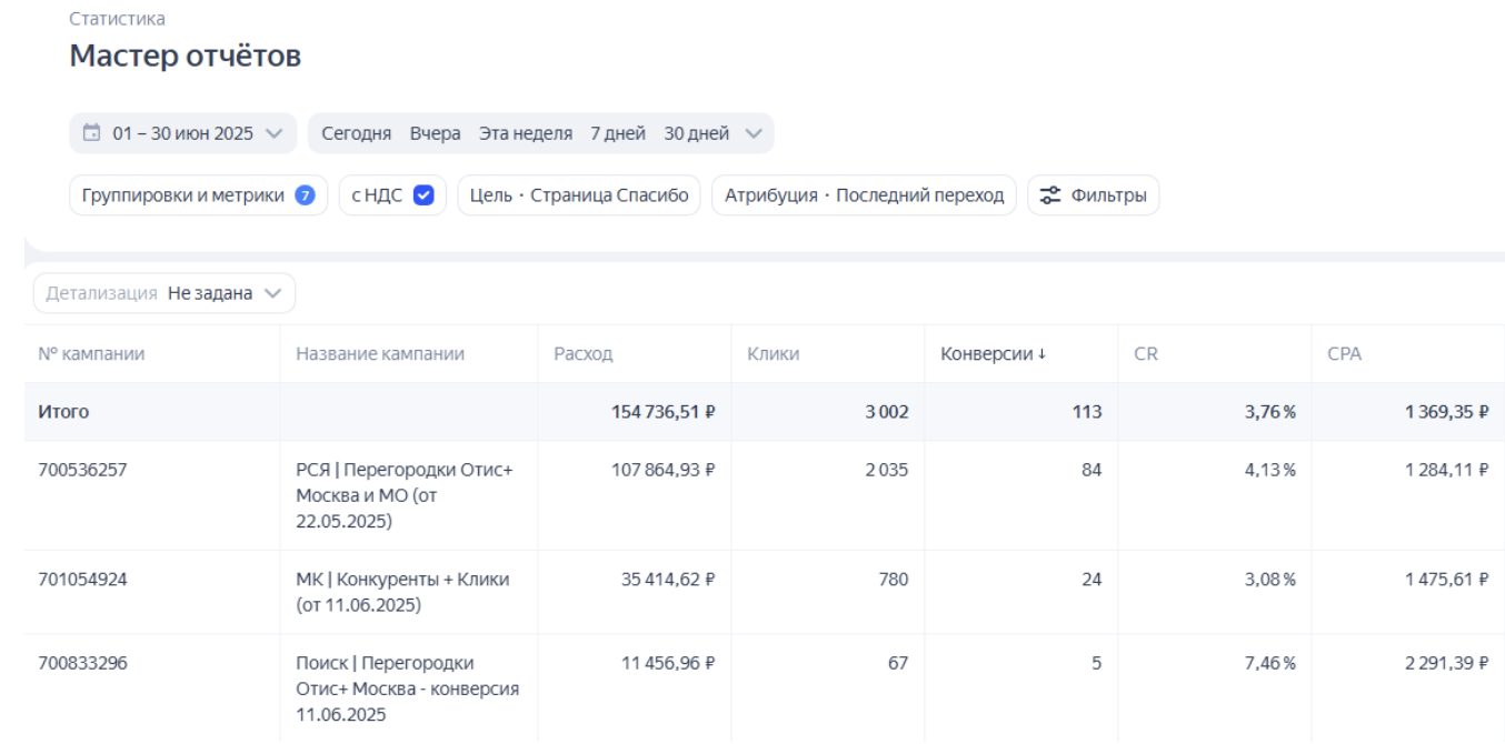 Главная цель — обеспечить стабильный поток лидов с минимальной стоимостью заявки и высокой конверсией. Стартовали с кампании Мастер кампаний (МК) с оплатой за клик, которая быстро обучилась и начала приносить заявки в рамках KPI.