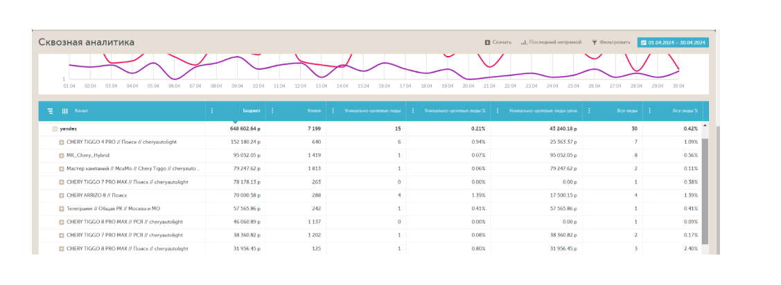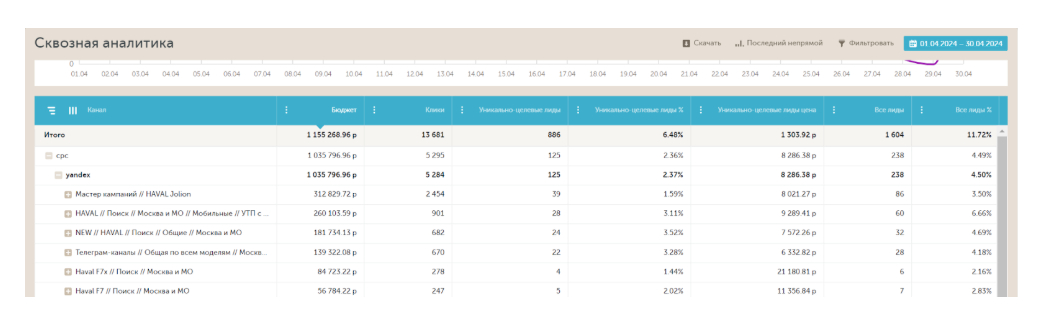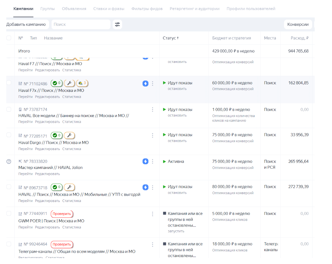 Для каждой модели были созданы свои отдельные рекламные кампании, а также общая кампания по каждому бренду.Пример рекламного аккаунта по Haval: