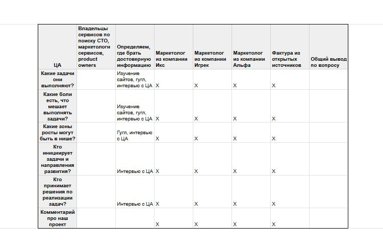 Сейчас я делаю подобную матрицу для сферы СТО (станций тех. обслуживания автомобилей), только вместо наших услуг я вношу фичи из проекта, который мы сделали для британской платформы по поиску СТО. Я беседую с маркетологами из этой ниши, набираюсь знаний о проблемах из первых рук. Если я пойму, что реализованный нами проект не ложится на российские запросы, я оставлю эту нишу на время, т. к. пока нет вариантов копать также глубоко и агрессивно, как и в нише с аутдором.