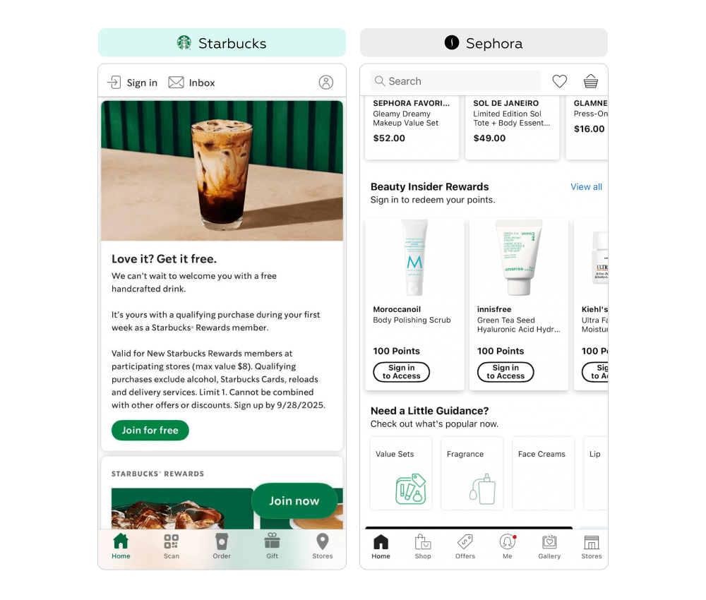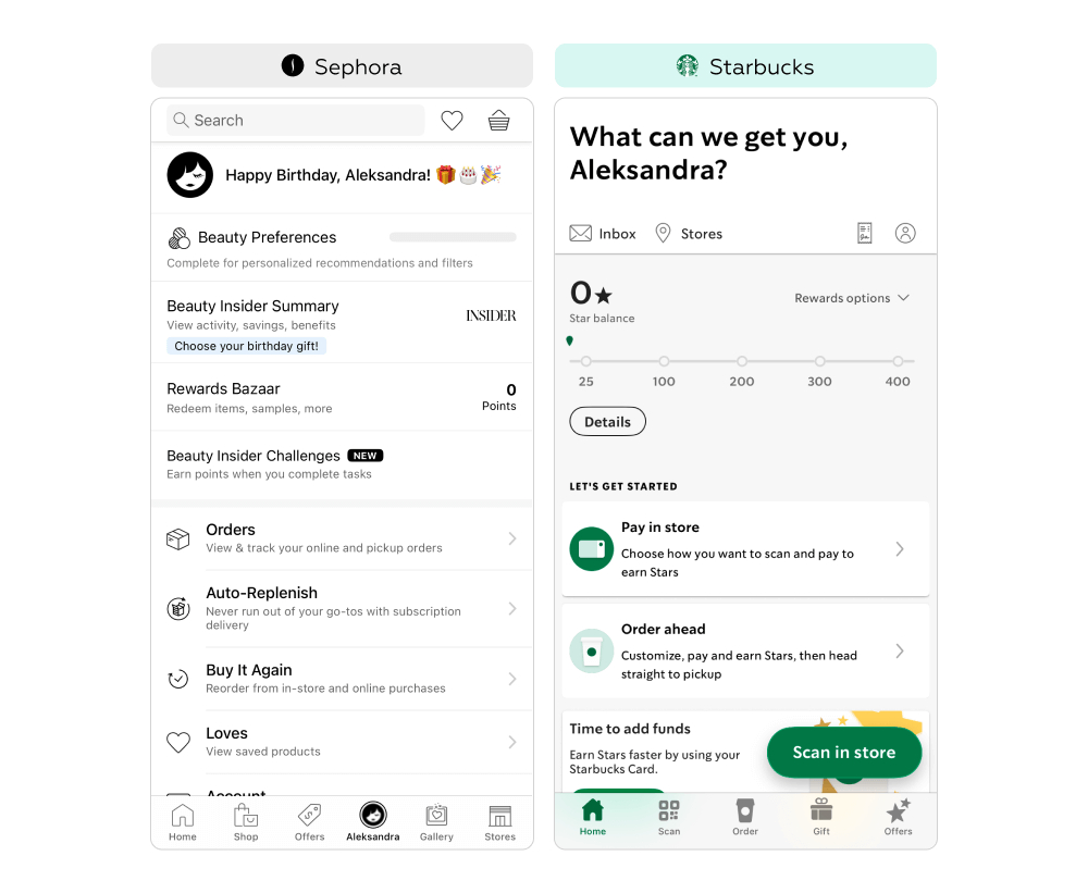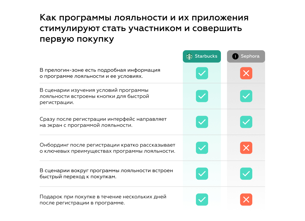 Мы выбрали Starbucks и Sephora, как представителей с крупным территориальным распространением и большой лояльной аудиторией по всему миру. В части случаев основной точкой первого контакта с программой лояльности является офлайн-магазин, однако мы рассмотрим именно цифровой канал — мобильное приложение, которое играет ключевую роль в контексте онлайн-заказов и управления программой лояльности.