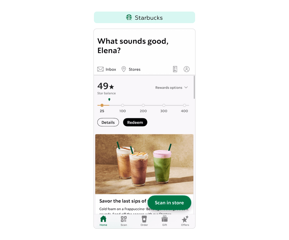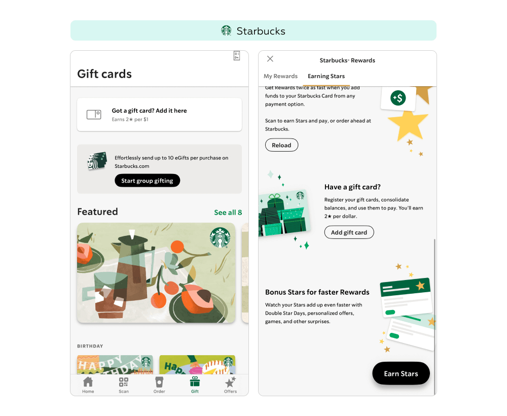 Реферальные механики с бонусами для обеих сторон помогают привлекать новых клиентов, но не снимают главный барьер — сложность первого контакта с брендом и понимания ценности программы. У Starbucks и Sephora реферальных программ нет, однако оба предлагают подарочные карты; при этом Starbucks дополнительно мотивирует владельцев подарочных карт привилегиями в рамках своей программы лояльности.
