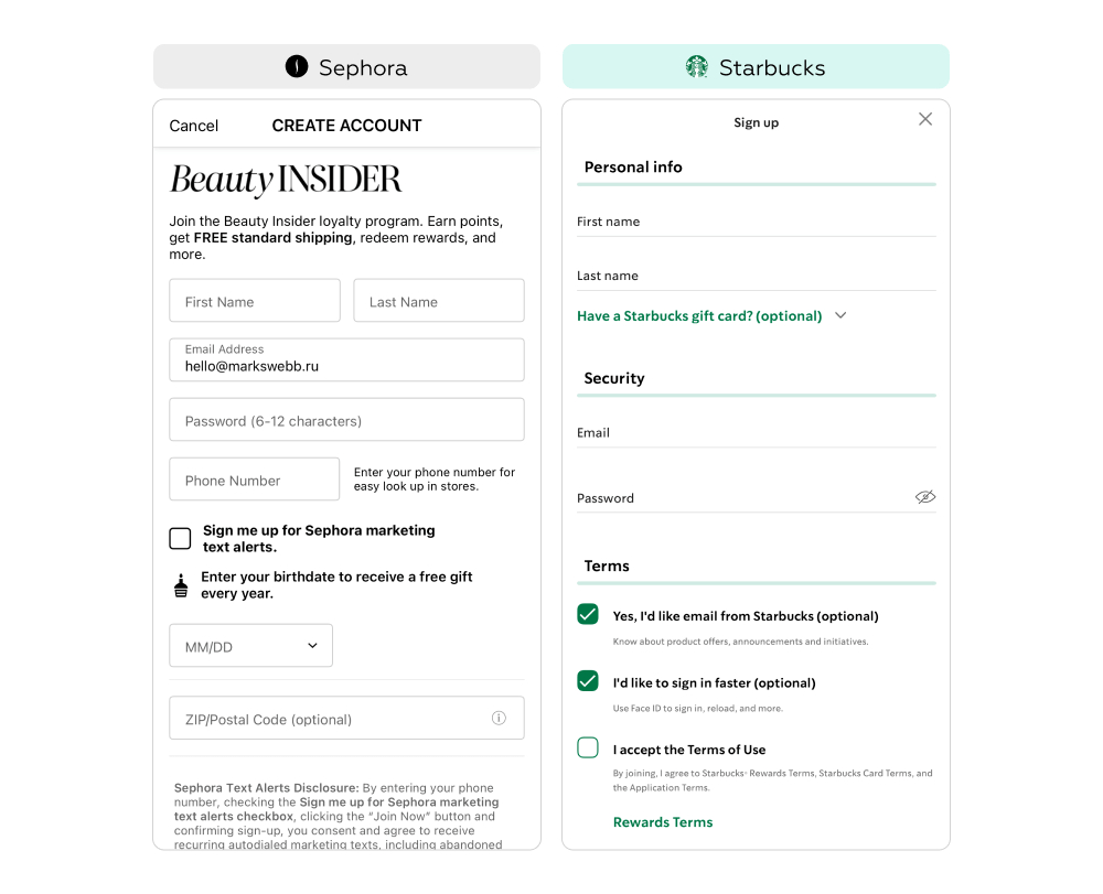 Регистрация также даёт бренду шанс собрать данные для персонализации, например дату рождения, чтобы дарить подарки. В Sephora эта дата встроена в форму с пояснением, зачем она нужна. В Starbucks её можно указать только в профиле после регистрации, и интерфейс не подсказывает о пользе — это снижает вероятность ввода данных и получения подарка.