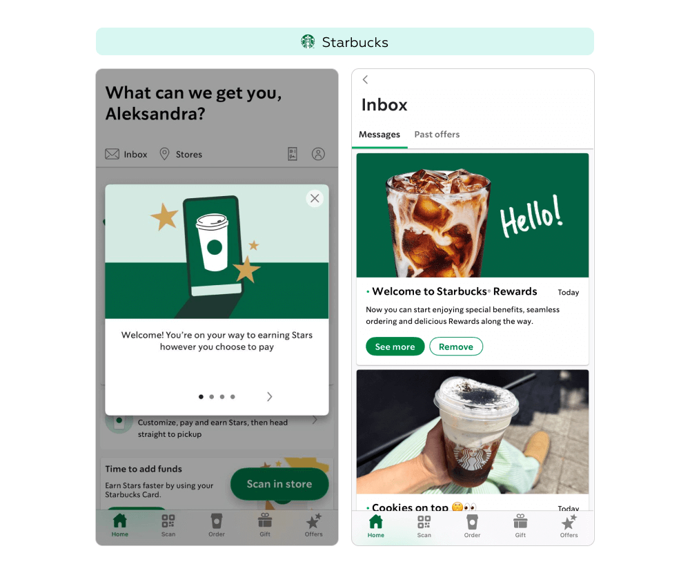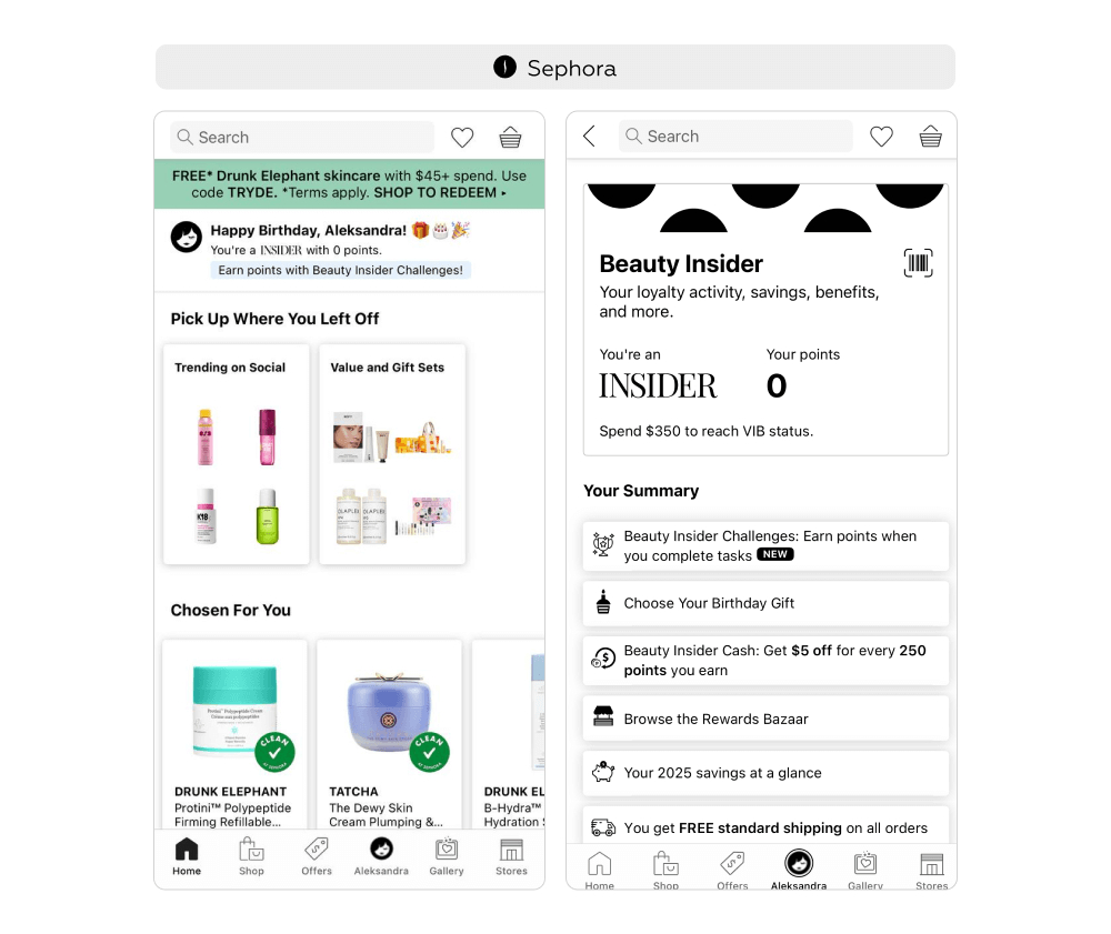 День рождения — удачный момент для укрепления эмоциональной связи с клиентом. В Sephora пользователи могут выбрать один из наборов мини-версий продуктов (6–8 вариантов в зависимости от уровня программы). В Starbucks постоянные клиенты получают напиток или снек на выбор. Такие подарки воспринимаются как реальная ценность: у Sephora они позволяют протестировать ассортимент и новые товары, а у Starbucks — легко вписываются в привычный сценарий визита в кофейню, создавая позитивную ассоциацию с брендом.