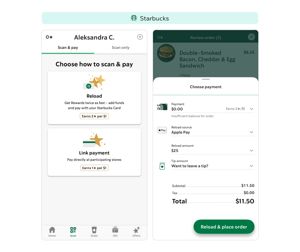 В Starbucks это решено через интеграцию информации и действий: на экране Details → Earning Stars описано, как зарабатывать бонусы, и тут же расположены кнопки Link payment («Привязать карту»), Reload («Пополнить счет») и Add gift card («Добавить подарочную карту»). Пользователь не тратит время на поиск, а сразу может привязать карту или пополнить счёт и получать больше звёзд.