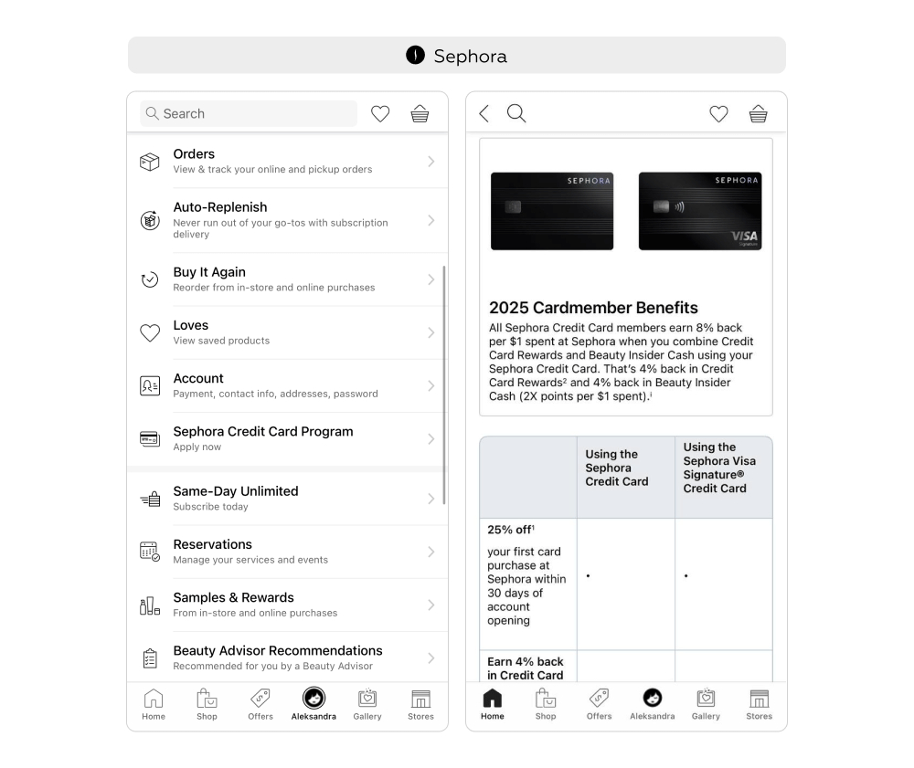 В приложении Sephora это реализовано через персонализированный баннер, который одновременно: