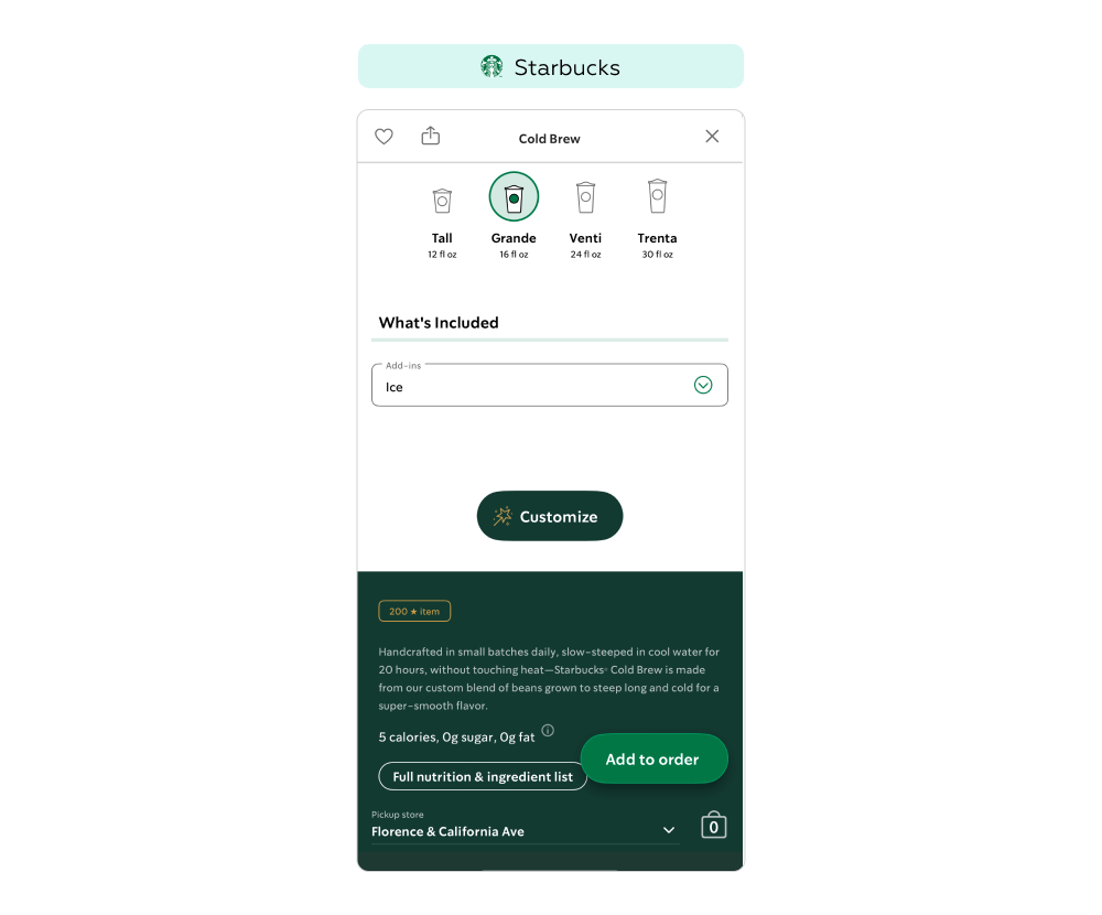 В Starbucks звезды можно обменять на улучшение напитка (например, добавить сироп за 25 звезд), полный напиток или снек (например, сендвич за 300 звезд), фирменные товары (например, стакан за 400 звезд). При этом в карточке каждого товара, доступного к оплате бонусами, рядом со стандартной ценой указана стоимость в звёздах программы лояльности. Такое решение: