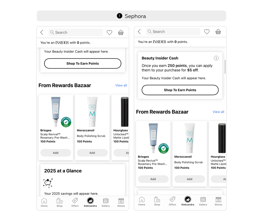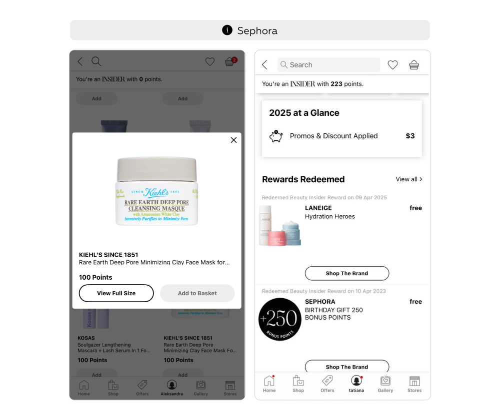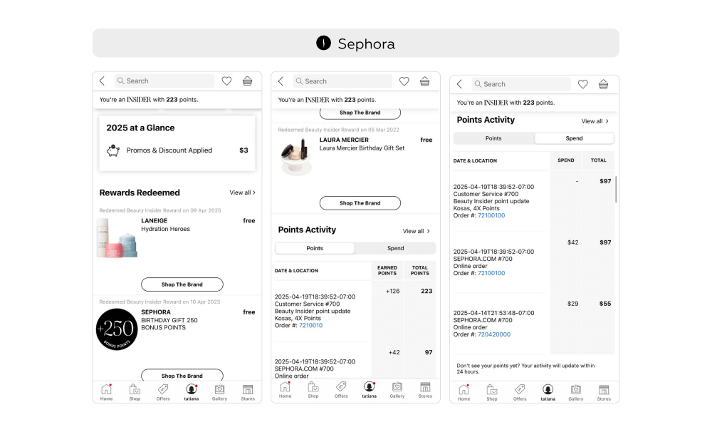 В разделе 2025 at a Glance («2025 в цифрах») в профиле пользователь видит общую сумму примененных акций и скидок за текущий год. Также в профиле есть раздел Rewards Redeemed («Полученные подарки»). Каждый полученный подарок отображается в виде карточки с датой получения, названием бренда и фотографией продукта. В разделе Points Activity («Операции с баллами») пользователь видит историю начисленных и потраченных бонусов. Для каждой операции доступна не только сумма полученных или списанных баллов, но и контекст — дата, место операции (онлайн или офлайн), номер заказа.