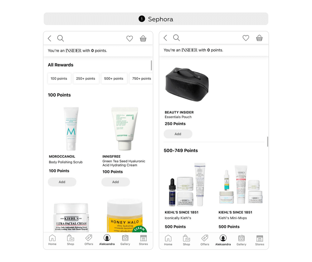 Sephora Beauty Insider решает эту задачу, предлагая два варианта использования баллов: