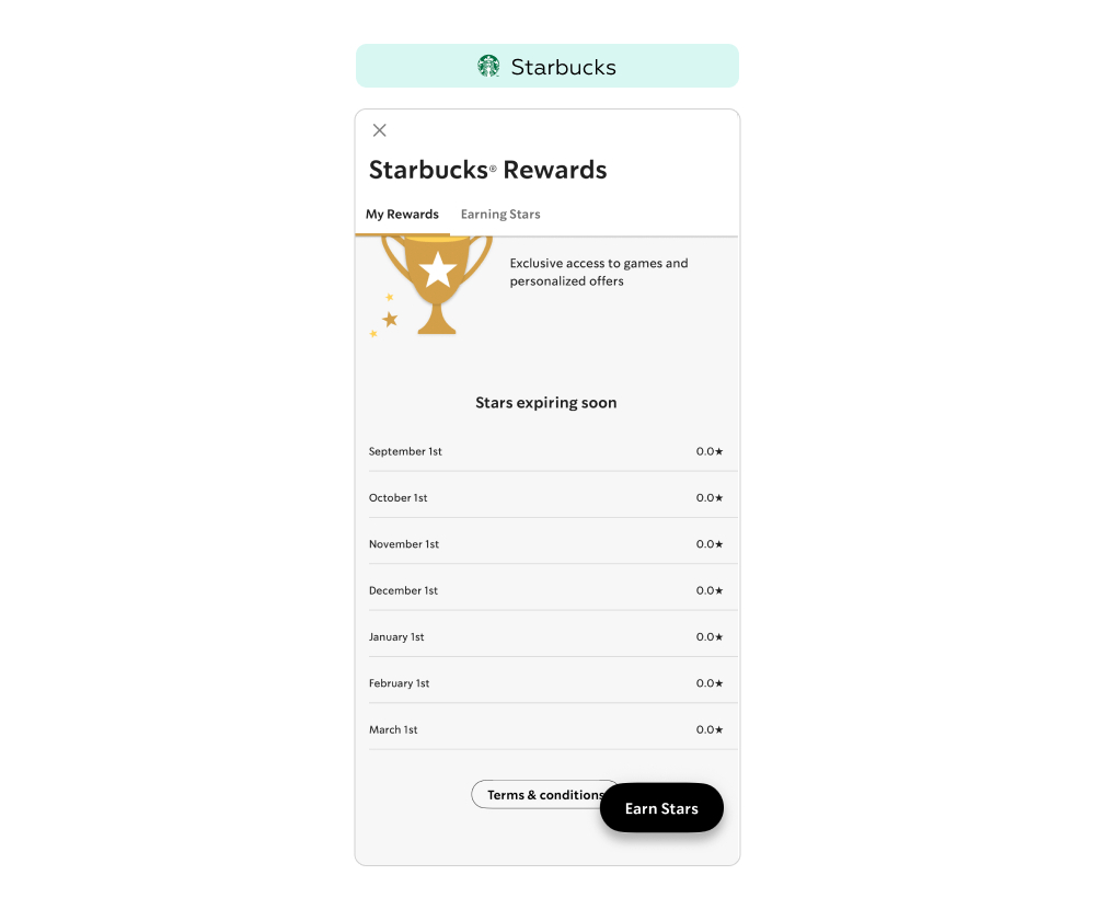 Во вкладке My Rewards раздела Starbucks Rewards, где содержится информация о бонусах пользователя и способах их потратить, реализован блок Stars expiring soon («Звезды, которые скоро сгорят») с графиком аннулирования накопленных звезд. На экране отображается помесячная таблица с конкретными датами (1 сентября, 1 октября и т.д.) и количеством звезд, которые будут списаны в каждый из этих периодов. Даже если баланс нулевой, система всё равно демонстрирует сам механизм — это формирует у пользователя понимание, что у его будущих бонусов будет ограниченный срок действия.