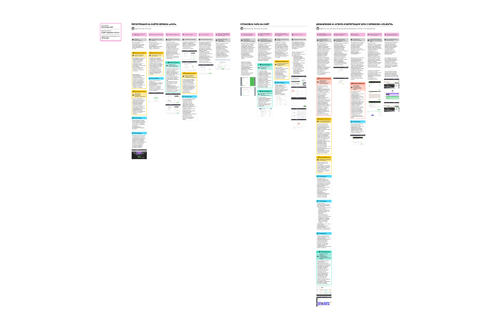 Инструкция настройки онлайн-чата представлена в виде прогресс-бара. Это помогает пользователю визуально систематизировать последовательность дальнейших действий, а также ознакомиться с другими продуктами сервиса в контексте выполняемой задачи.