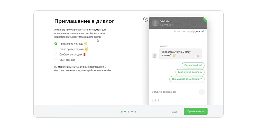 Дальнейшие шаги проходят более гладко. Пользователь настраивает точку входа для взаимодействия конечного клиента с агентом в чате. В окне настройки чата есть понятная визуальная подсказка: интерфейс меняется в реальном времени при редактировании настроек, что помогает пользователю быстро понять принцип работы. При выборе цвета фона интерфейс сразу меняется в демонстрационном макете, а при выборе типа приглашения появляются соответствующие шорткаты, которые будут показаны пользователям в реальном чате.