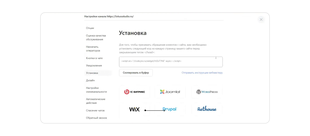 По завершении регистрации система сразу отображает код и кнопки с инструкцией для каждой системы для подключения онлайн-чата на сайт. Подобная навигация снижает барьер между первым входом и внедрением сервиса в существующую экосистему бизнеса.