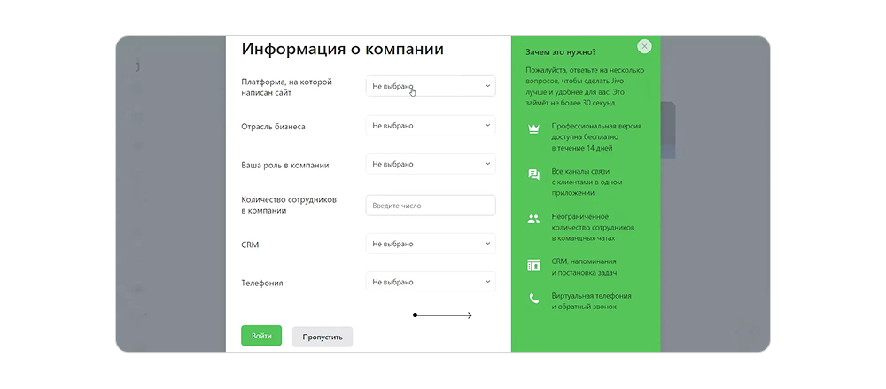 Можно детализировать данные о компании (отрасль, размер, роль пользователя), указать сервисы для интеграции, добавить команду или сразу перейти к настройке AI-агента. В отличие от этапа регистрации, шаги можно пропускать, нажимая на крестик в углу окна, и вернуться к ним в дальнейшем.