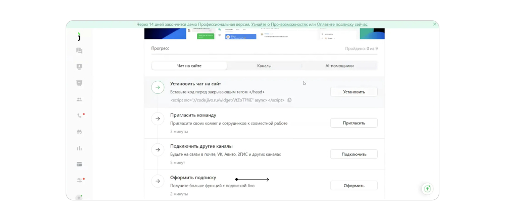 После шага с добавлением сотрудников в Jivo отображается главный экран с базовыми функциями сервиса и инструкцией по подключению чата к сайту. В инструкции объясняется, что для установки необходимо вставить специальную строку кода (код сразу доступен на экране). Также предлагается подключить дополнительные каналы (например, ВКонтакте, Авито и другие сервисы) и оформить подписку.