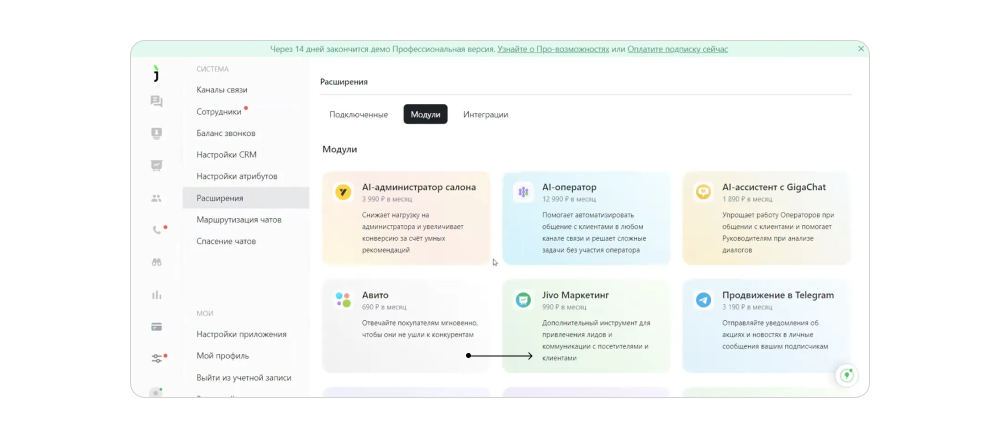 Мы остановились на платформе онлайн-чата Jivo, где пользователь может самостоятельно подключить AI-агента. Сервис предлагает услугу AI-администратора, которая объединяет функциональность чата, автономное взаимодействие с клиентом и интеграцию с CRM-системой.