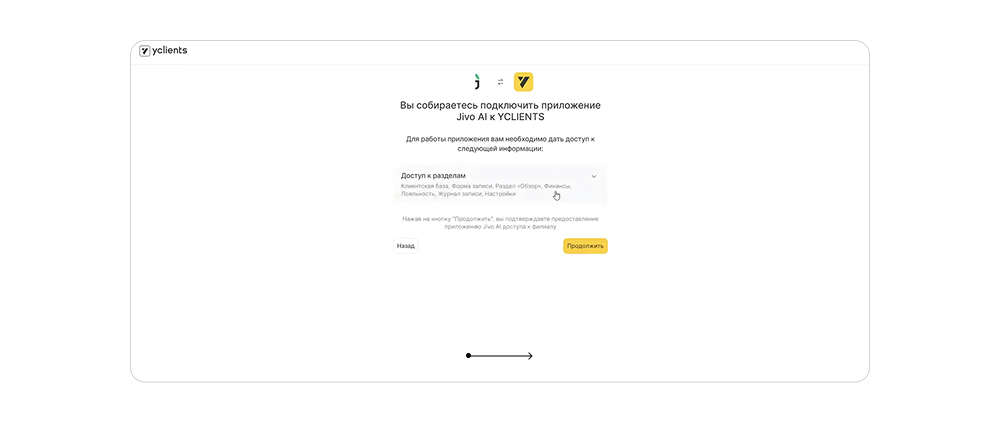 После нажатия на кнопку подключения AI-администратора салона пользователь автоматически перенаправляется в браузер на страницу авторизации партнёрского сервиса — «YCLIENTS», а после успешного входа — сразу в релевантный раздел интеграции Jivo AI.