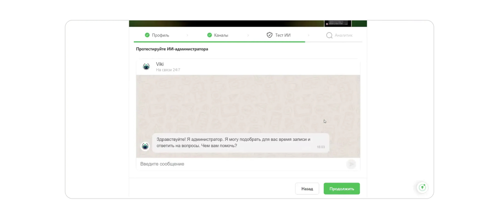 После настройки AI-агента система предлагает протестировать его работу с точки зрения конечного пользователя. Это необходимое свойство системы, так как цена ошибки может стоить потерянного клиента. При необходимости клиент может вернуться на предыдущие шаги и внести изменения.