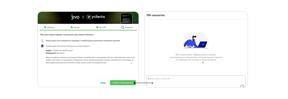 В результате на сайте клиента в онлайн-чате появляется AI-администратор, который консультирует пользователей по услугам компании, предлагает доступное время, отображенное в «YCLIENTS», для записи и непосредственно записывает на услуги.