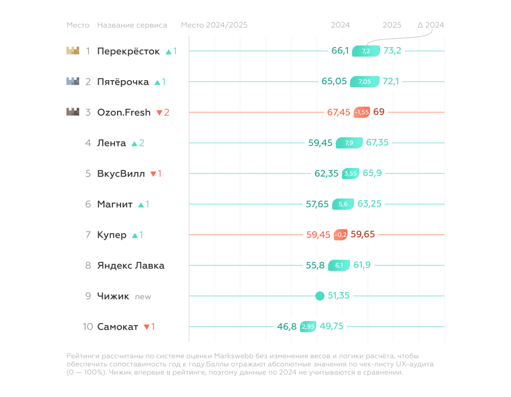 Рейтинг показывает общую расстановку сил на рынке. В этом году лидерами стали приложения Перекрёстка и Пятёрочки, заняв первое и второе места соответственно.