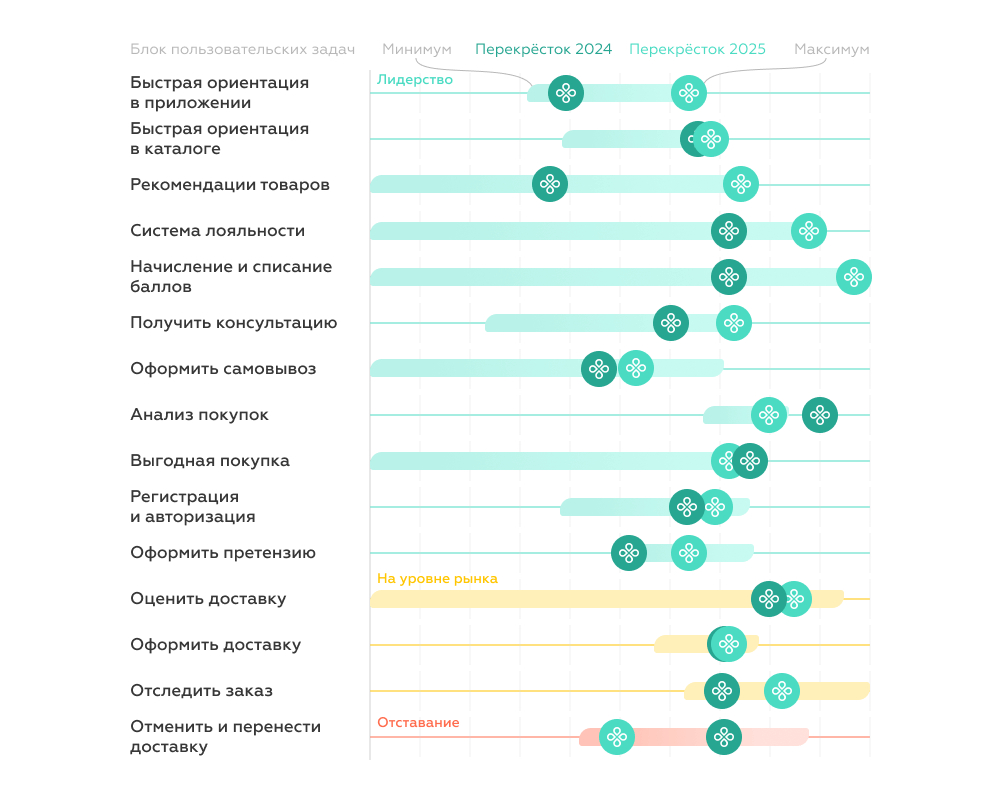 Значительные изменения уровня пользовательского опыта в приложении Перекрёстка мы отметили за счет расширения функциональности уведомлений. Оценка блока задач «Настройка уведомлений» в сервисе в этом году повысилась на 35 баллов за счет развития коммуникационных сценариев. Эти изменения повысили прозрачность взаимодействия и усилили ценность уведомлений. Также выросло качество пользовательского опыта в критериях «Сквозной поиск по приложению» и «Онбординг в новые функции» — на 67,5 баллов и 75 баллов соответственно. Динамика связана с развитием навигационных и обучающих сценариев, которые упростили ориентацию в интерфейсе.