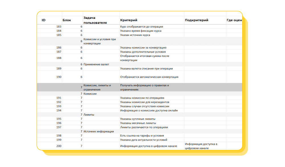 В каждом мы обследовали сайт и мобильное приложение. Оценивали каждый сервис через агентов-иностранцев, которые не были клиентами банков на момент исследования. Они обеспечивали доступ к цифровым сервисам, после чего исследователи Markswebb фиксировали реализацию критериев — всего более 200 в девяти блоках задач. Проверяли лично их в каждом сервисе по бинарной модели: каждый критерий либо выполнен, либо нет, фиксировали фактический опыт.
