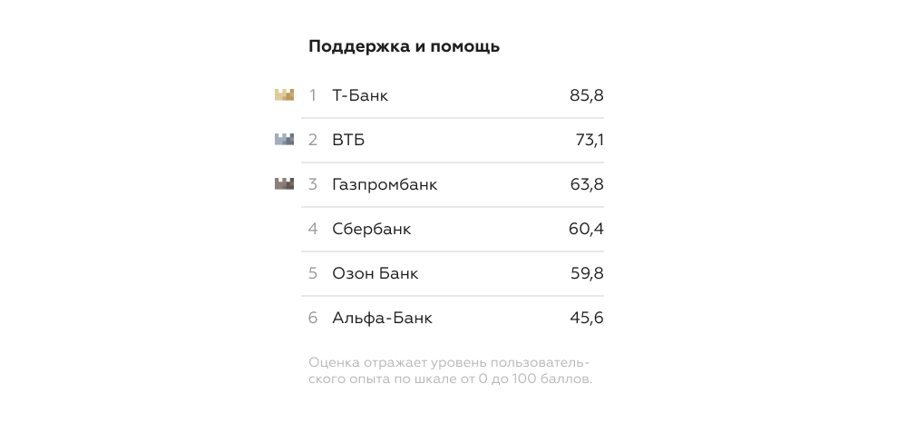 Поддержка и помощь — один из самых дифференцирующих блоков. Разрыв между лидером (Т-Банк — 85,8) и последним местом (Альфа-Банк — 45,6) превышает 40 баллов. Разница возникает в уровне адаптации сервисов для иностранцев: доступности каналов, прозрачности информации, наличии помощи на иностранном языке и интеграции сервисов прямо в приложении.