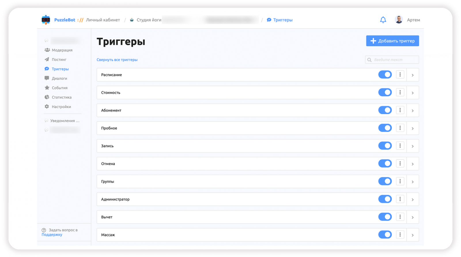 В PuzzleBot это делается через триггеры — функционал, позволяющий задавать различные слова, фразы и иные условия, при отправке которых бот производит различные действия: отправляет сообщения, команды, блокирует пользователя, удаляет из чата и т.д.