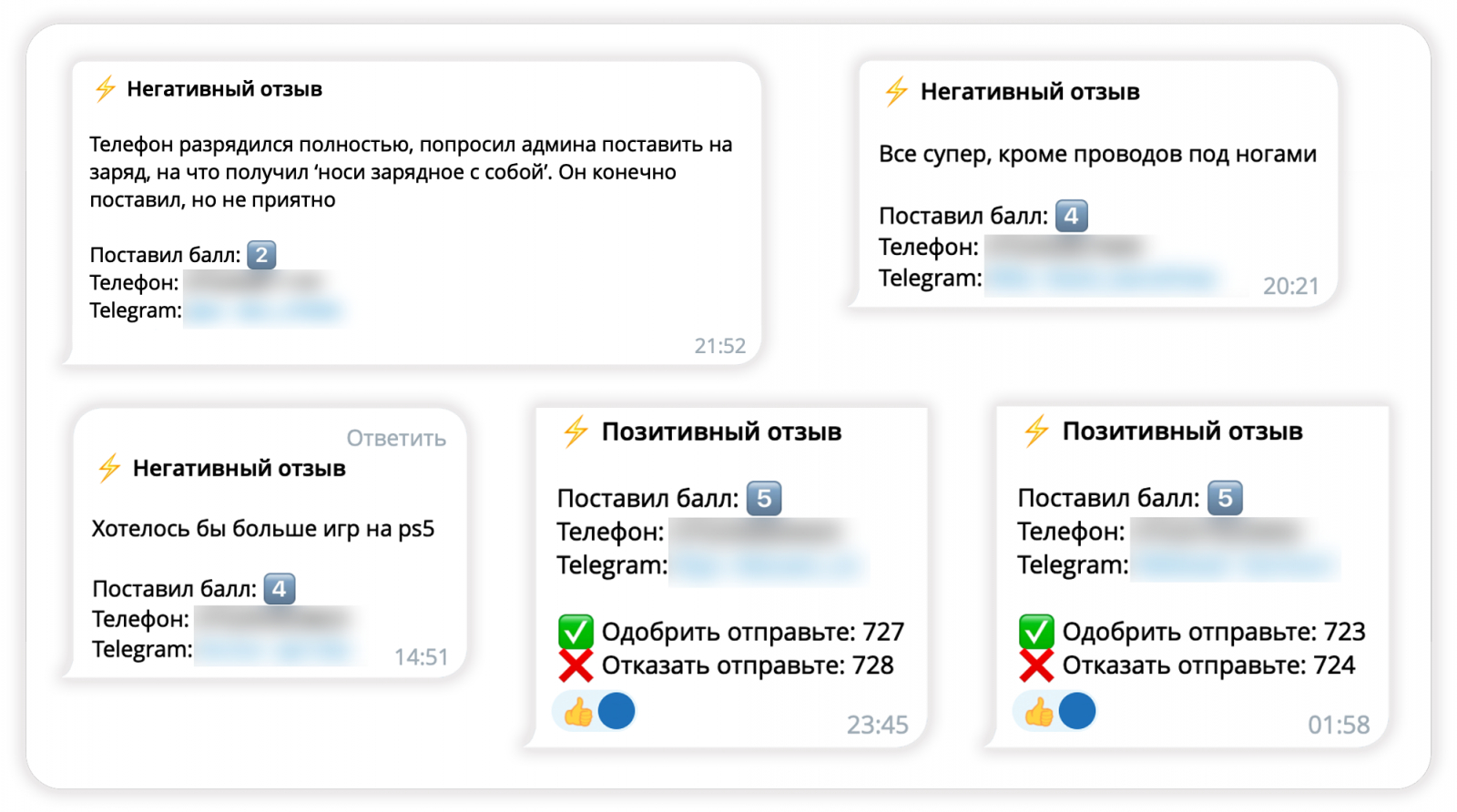 Негативный отзыв. Если клиент остался недоволен, его отзыв отправляется в группу для отработки. Так можно быстро связаться и разрешить ситуацию. Уведомление с отзывом содержит контакты, чтобы связаться с клиентом и отработать негативный случай.